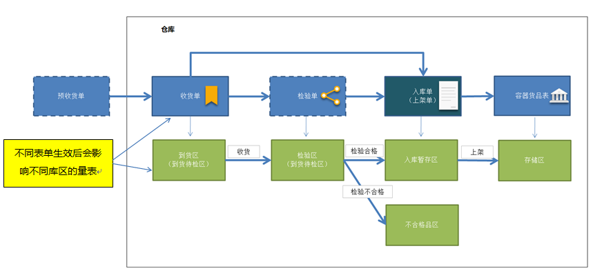 - 如果不需要檢驗,從收貨單直接到入庫單(上架單)。貨物的狀態設置為“合格”并且減<到貨區>該貨物的存儲量,加<入庫暫存區>該貨物的存儲量,貨物狀態改為“合格”。注意:在這個庫區,貨物的這個狀態是可以支持不上架直接出庫了。這種情況在生產型企業還是比較普遍的。