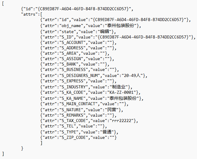 local setAttr = ‘[{“attr”:”S_KA_CODE”,”value”:”‘..strKASCode..'”},{“attr”:”S_KA_NAME”,”value”:”‘..strKAName..'”},{“attr”:”S_INDUSTRY”,”value”:”‘..strINDUSTRY..'”},{“attr”:”S_NATURE”,”value”:”‘..strNATURE..'”},{“attr”:”S_ACCOUNT”,”value”:”‘..strACCOUNT..'”},{“attr”:”S_TEL”,”value”:”‘..strTEL..'”},{“attr”:”S_ADDRESS”,”value”:”‘..strADDRESS..'”},{“attr”:”S_BANK”,”value”:”‘..strBank..'”},{“attr”:”S_EXPRESS”,”value”:”‘..strEXPRESS..'”},{“attr”:”S_TAX_CODE”,”value”:”‘..strKAtax..'”}]’