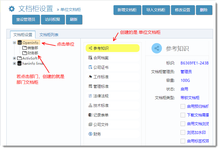 1)創(chuàng)建(文檔柜),并設(shè)置文檔柜管理員及文檔柜回收箱管理員。(文檔柜管理員與回收箱管理可以是不通的人;超級管理員不能是文檔柜管理員)