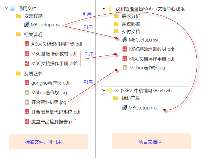 Mobox的引用文件管理功能與制造業(yè)中的借用件管理很相似。完美的解決了一個文件在不同文檔柜、文件夾中的多次出現(xiàn)(降低的存儲空間),也可以實現(xiàn)原始文件修改后,引用該文件的文件夾內(nèi)的文件也會自動更新。