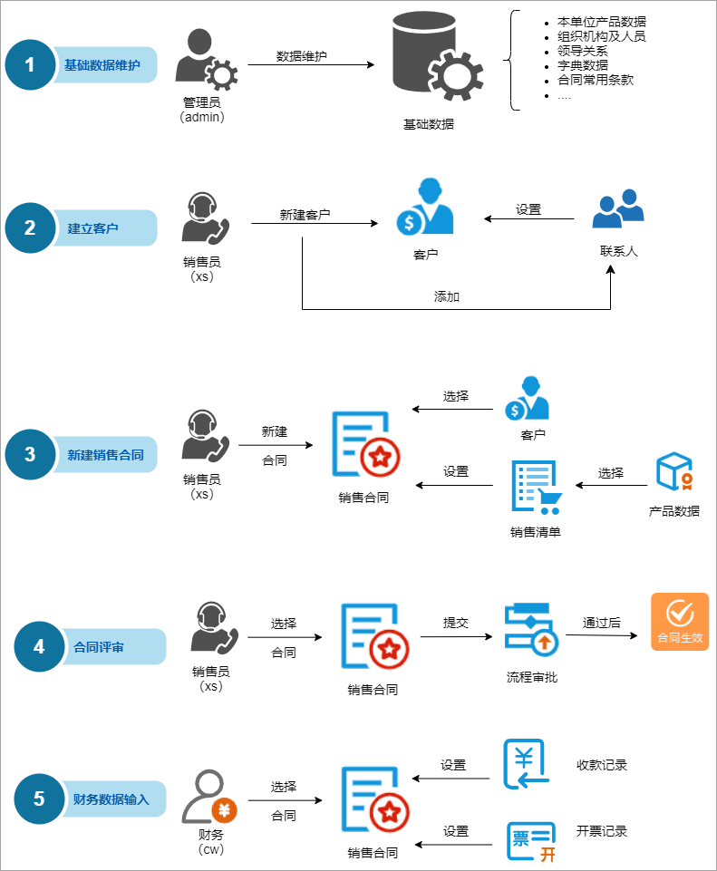 合同軟件涉及的企業(yè)員工角色:銷售、采購(gòu)、管理員、主管、財(cái)務(wù)。以下是各個(gè)角色主要需要做的事情。
