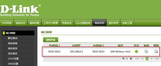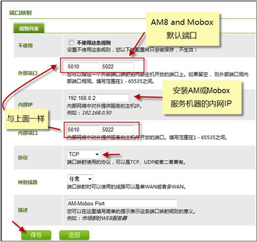 將Mobox企業(yè)云盤相關(guān)服務(wù)所用到的端口(默認(rèn)是 5010~5022)進行端口映射設(shè)置,若自己與改過Mobox服務(wù)端的端口,則按實際的端口配置 (AM即時通的端口也是一樣的)