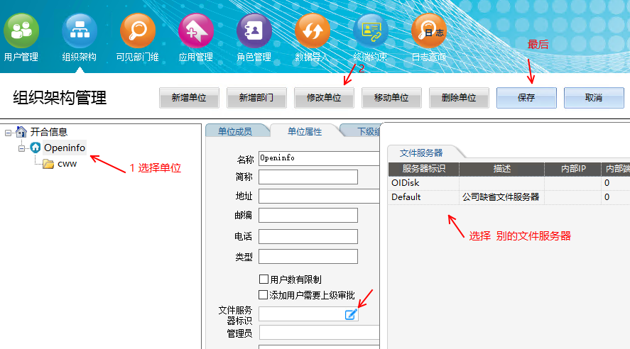 系統(tǒng)設(shè)置默認(rèn)文件服務(wù)器后,一般情況下,所有文件上傳都采用這個文件服務(wù)器,但也有特殊的需要,比如某一個單位的,要采用另外的文件服務(wù)器(參考下圖)