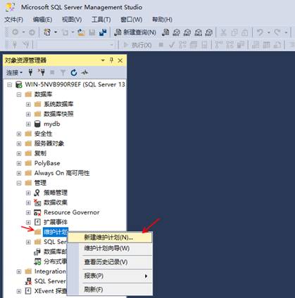 2、在對象資源管理器列表中展開“管理”選項卡,右鍵單擊“維護計劃”>“新建維護計劃…”