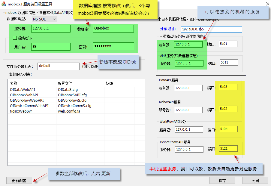修改Mobox3系統數據庫連接及相關服務端口 2024/07/25 分類:產品中心 產品手冊 視頻中心 598 修改Mobox3系統數據庫連接及相關服務端口的作用 1、我們在實施的時候,一個工程師可能負責多個項目。而每一個項目會有自己的mobox數據庫。為了方便一個mobox3系統隨時切換不同的項目。我們可以通過修改其數據庫連接來完成 2、mobox3的端口修改,是因為,mobox3用到的端口,可能甲方不讓用,我們需要修改 實現過程 1、下載mobox3配置修改工具 點擊下載 下載后,解壓 2、按說明進行修改相關參數 參考視頻: http://www.llongwill.com.cn/wp-content/uploads/2024/07/mobox3cfg-modify.mp4 標簽:手冊視頻 上一篇: SQLServer數據庫備份 下一篇: mobox數據異地備份部署方案
