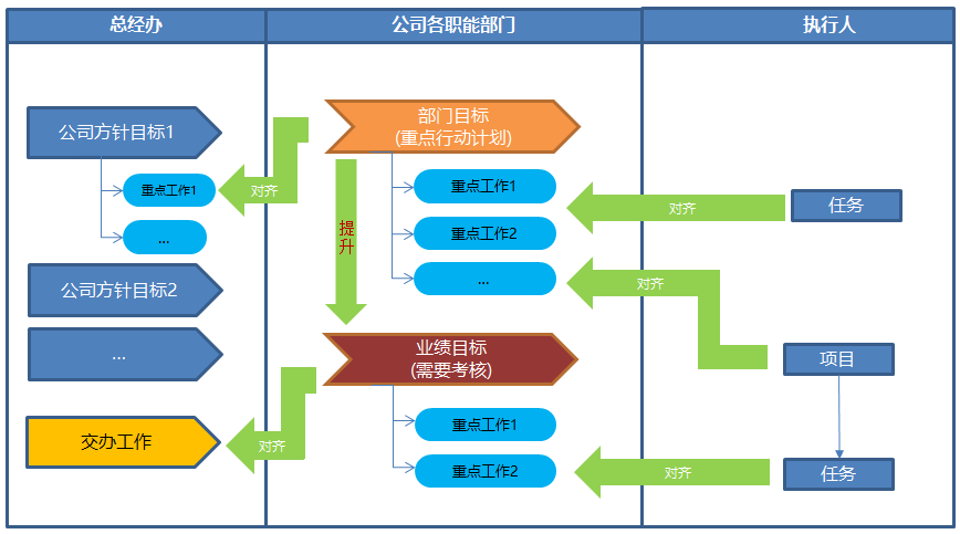 以公司戰略目標為導向,承接公司管理層考核要求,自上而下推進、自下而上支持,做到“計劃有源頭、執行有力度、成果有考核”。構建以“企業戰略目標” 為主線,“工作任務” 為驅動的重點工作管理平臺