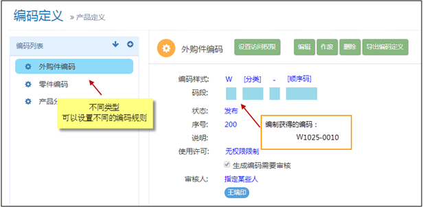 編碼定義即編碼規(guī)則定義,在該功能中可以定義某種編碼的組成規(guī)則,編碼由各種類型的碼段組成,碼段有長度和顯示順序及相互之間的關(guān)系。在編碼定義中可以設(shè)置編碼由哪些碼段組成?確定碼段的順序、碼段的長度、碼段之間的關(guān)系等信息,設(shè)置編碼的允許使用范圍,比如設(shè)置某一個(gè)編碼只允許某些人員、角色、部門能使用,也可以設(shè)置在申請(qǐng)編碼時(shí)是否需要有人審核,由誰審核? 可以有效對(duì)編碼的使用進(jìn)行管理。