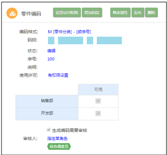 上圖所示,零件編碼只允許“銷售部”“開發(fā)部”使用,申請(qǐng)編碼時(shí)需要由“綜合調(diào)度員”進(jìn)行審核