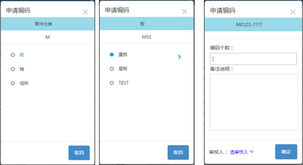 在上圖中最右邊一頁是當(dāng)所有的碼段都已經(jīng)設(shè)置完畢后出現(xiàn)的申請(qǐng)頁面,可以輸入申請(qǐng)的編碼的個(gè)數(shù)和原因,如果申請(qǐng)需要審核在這個(gè)頁面可以選擇審核人。