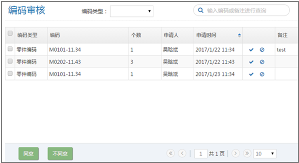 編碼審核就是對(duì)提交上來的編碼申請(qǐng)進(jìn)行判斷是否允許申請(qǐng)者使用的過程。一般是有企業(yè)的管理人員擔(dān)當(dāng)審核這樣的角色。該功能點(diǎn)沒有太多的概念,僅僅就是一個(gè)列表顯示所有需要操作這審核的編碼申請(qǐng),點(diǎn)中后進(jìn)行“同意”“不同意”操作,頁面如下圖所示。